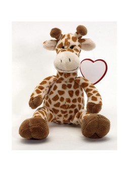 Peluche personnalisée en forme de girafe avec marquage possible sur le coeur. Le tarif "à partir de" est valable pour des quantités supérieures à 5000 pièces. Minimum de commande : 50 pièces.