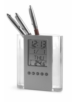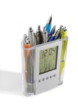 Pot à crayons publicitaire en acrylique transparent avec fonction pendule, thermomètre et calendrier ! Minimum de commande : 100 pièces Caractéristiques clés : Dimensions : 9 x 5,1 x 11,8 cm Matière : Acrylique / Plastique / LCD / ABS Poids : 152 g