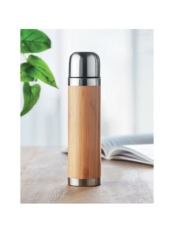 Gourde isotherme personnalisée à double paroi en acier inoxydable et en bambou. Le tarif "à partir de" est valable pour des quantités supérieures à 5000 pièces. Minimum de commande : 50 pièces