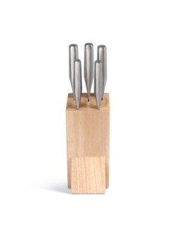 Set de 5 couteaux publicitaires. Couteaux en acier inoxydable et bloc en bois naturel. Le tarif "à partir de" est valable pour des quantités supérieures à 5000 pièces. Minimum de commande : 25 pièces