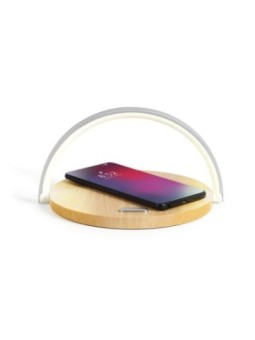 Lampe de chevet et chargeur sans fil personnalisable. Lampe de chevet avec 3 modes d’éclairage : lumière naturelle, blanche ou jaune.  Le tarif "à partir de" est valable pour des quantités supérieures à 5000 pièces.  Minimum de commande : 25 pièces