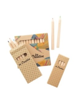 Crayons de couleurs publicitaires en bois dans une boite en papier kraft ! Le tarif "à partir de" est valable pour des quantités supérieures à 5000 pièces.  Minimum de commande : 500 pièces  Caractéristiques clés : Dimensions : 45 × 90 × 9 mm Poids : 14 g Matière : Bois / Papier