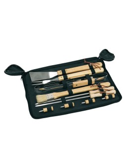 Set d'outils de barbecue promotionnel en acier inoxydable. Le tarif "à partir de" est valable pour des quantités supérieures à 1000 pièces. Caractéristiques clés : Dimensions : 45X15X4CM Matières : Acier inoxydable, bois et toile Marquages : Sérigraphie, transfert et gravure laser