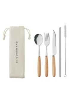 Set de couverts publicitaire en acier inoxydable et bois. Le tarif "à partir de" est valable pour des quantités supérieures à 5000 pièces. Minimum de commande : 100 pièces