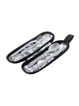 Set de 3 couverts publicitaires : cuillère, fourchette et couteau lame micro-dentée Le tarif "à partir de" est valable pour des quantités supérieures à 5000 pièces. Minimum de commande : 60 pièces.