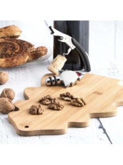 Planche à découper publicitaire en bambou. Planche personnalisée de forme originale avec poignée en métal plastique. Le tarif "à partir de" est valable pour des quantités supérieures à 5000 pièces. Minimum de commande : 50 pièces