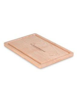 Planche à découper publicitaire en bambou avec goutière pour éviter de faire tomber les miettes de pain. Le tarif "à partir de" est valable pour des quantités supérieures à 5000 pièces. Minimum de commande : 50 pièces