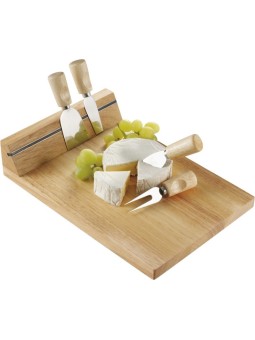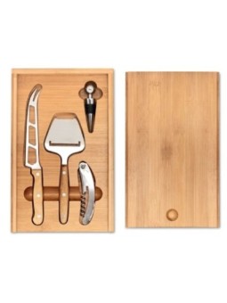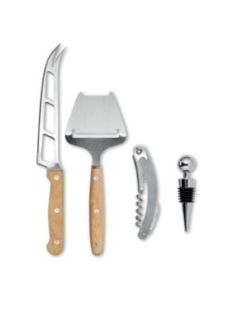 Set à fromage publicitaire comprenant un couteau, une fourchette et un tire-bouchon dans un plateau en bois. Le tarif "à partir de" est valable pour des quantités supérieures à 5000 pièces. Minimum de commande : 25 pièces