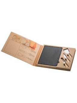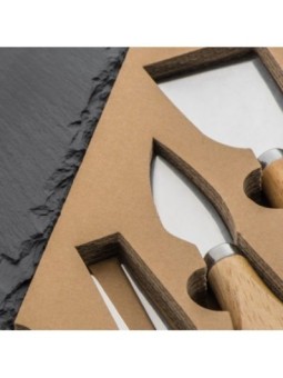 Ensemble de couteaux à fromage publicitaires et d'une ardoise de présentation de fromage. Le tarif "à partir de" est valable pour des quantités supérieures à 5000 pièces. Minimum de commande : 25 pièces