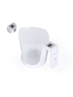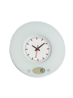 Balance de cuisine personnalisé digitale affichant une horloge analogique et accrochagble au mur. Le tarif "à partir de" est valable pour des quantités supérieures à 5000 pièces. Minimum de commande : 25 pièces