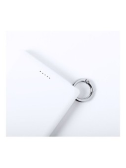Power bank USB personnalisée en plastique avec pile 5000 mAh, chargeur sans fil intégré et anneau mousqueton en métal. Le tarif "à partir de" est valable pour des quantités supérieures à 5000 pièces. Minimum de commande : 25 pièces