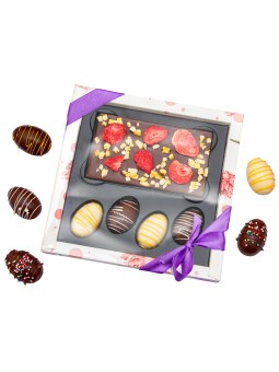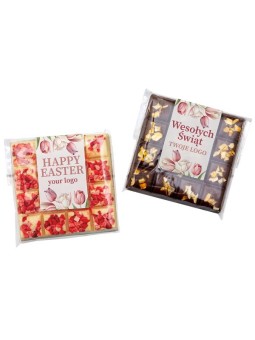Carré de chocolat au fruit, idéale pour Pâques !  Le tarif "à partir de" est valable pour des quantités supérieures à 1000 pièces. Le minimum de commande possible pour les tablettes publicitaires est de 100 pièces. Caractéristiques clés : Poids : 76 g Composition : Chocolat au lait 44% cacao avec...