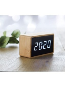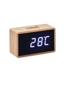 Réveil publicitaire en bambou avec affichage LED (heure et température). Le bambou est un produit naturel avec des variations de couleur et de taille par article. Le tarif "à partir de" est valable pour des quantités supérieures à 5000 pièces.  Minimum de commande : 50 pièces