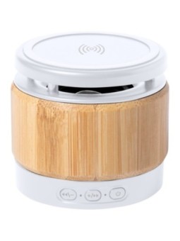 Haut-parleur Bluetooth personnalisable dans un boîtier en bambou et plastique, avec chargeur sans fil intégré pour portable et batterie rechargeable. Le tarif "à partir de" est valable pour des quantités supérieures à 5000 pièces. Minimum de commande : 50 pièces