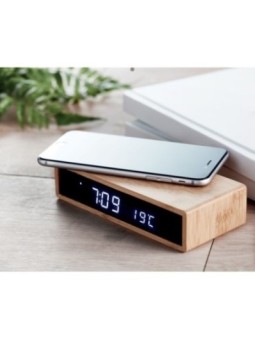 Chargeur sans fil personnalisable en bambou incluant un réveil avec affichage par LED bleue et température.  Le tarif "à partir de" est valable pour des quantités supérieures à 5000 pièces.  Minimum de commande : 50 pièces
