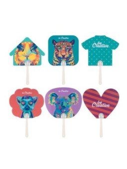 Eventail avec poignée à personnaliser. Différentes formes disponibles. Le tarif "à partir de" est valable pour des quantités supérieures à 5000 pièces. Minimum de commande : 500 pcs
