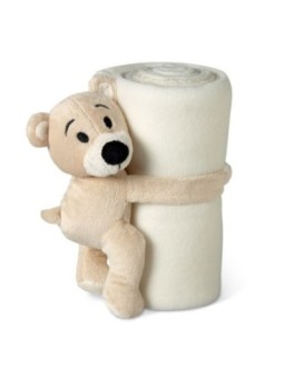 Couverture publicitaire polaire pour enfants avec nounours tenant la couverture avec des mains en velcro. Le tarif "à partir de" est valable pour des quantités supérieures à 5000 pièces. Minimum de commande : 50 pièces