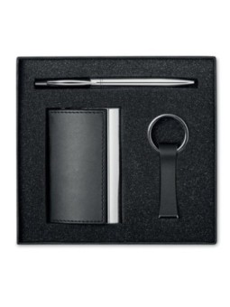 Set cadeau d'affaires personnalisé (stylo, porte-clés et porte-cartes). Différentes personnalisations possibles. Le tarif "à partir de" est valable pour des quantités supérieures à 5000 pièces. Minimum de commande : 100 pièces