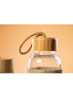 Gourde personnalisable en verre avec manchon en polyester de couleur naturel, couvercle en bambou et cordelette. Le tarif "à partir de" est valable pour des quantités supérieures à 5000 pièces. Minimum de commande : 50 pièces