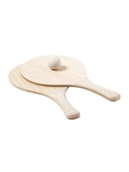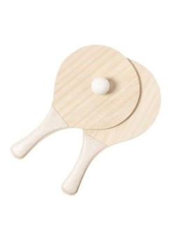 Tennis de plage personnalisable en bois et plastique écologique. Le tarif "à partir de" est valable pour des quantités supérieures à 5000 pièces. Minimum de commande : 72 pièces.