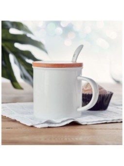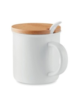 Mug en porcelaine personnalisé disponible avec couvercle en bambou. Le tarif "à partir de" est valable pour des quantités supérieures à 5000 pièces. Minimum de commande : 100 pièces