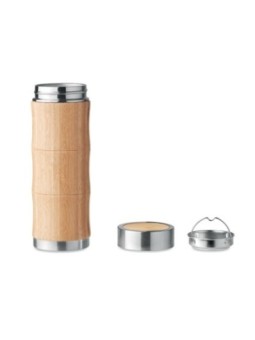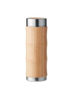 Gourde 350ml en acier inoxydable. Couvercle en bambou personnalisable. Le tarif "à partir de" est valable pour des quantités supérieures à 5000 pièces. Minimum de commande : 50 pièces
