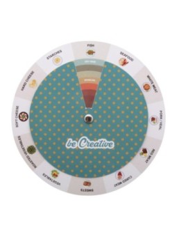 Disque d'accord vins-mets publicitaire. Disque en papier de fabrication européenne. Le tarif "à partir de" est valable pour des quantités supérieures à 5000 pièces. Minimum de commande : 500 pièces