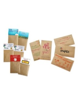 Sachet de graines personnalisé en papier kraft avec impression possible sur le sachet en quadri. Le tarif "à partir de" est valable pour des quantités supérieures à 5000 pièces. Tarif comprenant l'impression quadri. Minimum de commande : 300 pièces.
