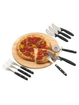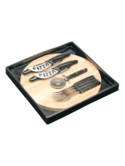 Planche à pizza publicitaire avec 4 fourchettes, 4 couteau et une roulette pour découper. Le tarif "à partir de" est valable pour des quantités supérieures à 5000 pièces. Minimum de commande : 25 pièces