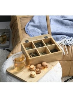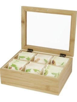 Boîte à thé publicitaire fabriquée en bambou avec couvercle transparent. Le tarif "à partir de" est valable pour des quantités supérieures à 5000 pièces. Minimum de commandes : 25 pièces
