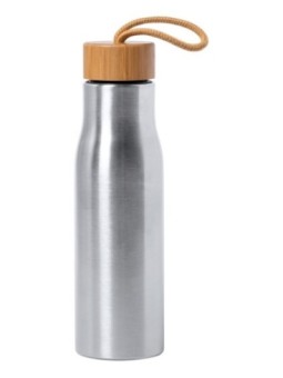 Gourde personnalisable en inox avec couvercle en bambou et cordelette. Le tarif "à partir de" est valable pour des quantités supérieures à 5000 pièces. Minimum de commande : 100 pièces