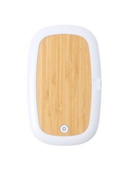 Boîte de stérilisation UV-C personnalisable avec chargeur sans fil recouvert de bambou. Le tarif "à partir de" est valable pour des quantités supérieures à 5000 pièces. Minimum de commande : 25 pièces