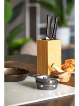 Bloc de couteaux universel publicitaire en bambou. Un produit écologique. Le tarif "à partir de" est valable pour des quantités supérieures à 5000 pièces. Minimum de commandes : 20 pièces