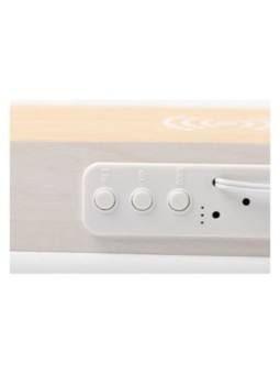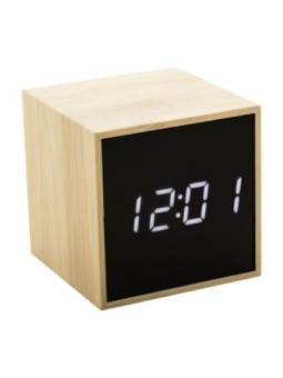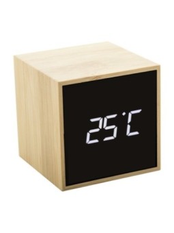 Réveil numérique publicitaire avec thermomètre recouvert de bambou et écran LED avec chiffres en blanc. Le tarif "à partir de" est valable pour des quantités supérieures à 5000 pièces. Minimum de commande : 25 pièces