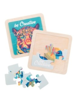 Puzzle personnalisé en bois et en plastique composé de 9 pièces. Le tarif "à partir de" est valable pour des quantités supérieures à 5000 pièces. Minimum de commande : 300 pièces.