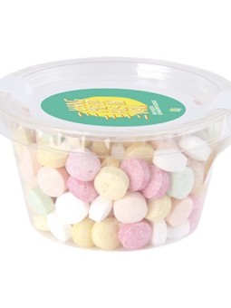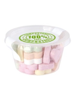 Boîtiers biodégradables promotionnels contenant des bonbons ! Le tarif "à partir de" est valable pour des quantités supérieures à 5000 pièces. Minimum de commande : 500 pièces. Caractéristiques clés : Dimensions : 70 mm Ø x 41 mm. Remplissage 60 gr. Green