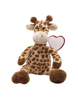 Peluche personnalisée en forme de girafe avec marquage possible sur le coeur. Le tarif "à partir de" est valable pour des quantités supérieures à 5000 pièces. Minimum de commande : 50 pièces.