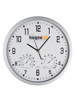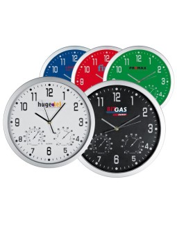 Horloge de bureau publicitaire colorée avec thermomètre et hygromètre. Le tarif "à partir de" est valable pour des quantités supérieures à 5000 pièces. Minimum de commande : 50 pièces.