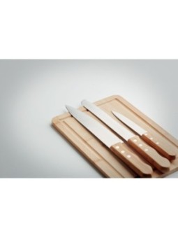 Set de planche à découper personnalisée en bambou avec 3 couteaux aiguisés. Le tarif "à partir de" est valable pour des quantités supérieures à 5000 pièces. Minimum de commande : 50 pièces