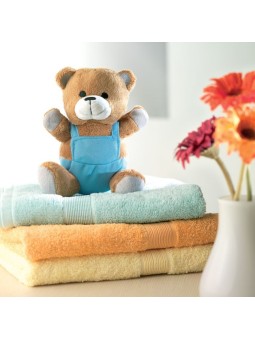 Ourson en peluche publicitaire vêtu d'une salopette bleue et personnalisable par transfert. Le tarif "à partir de" est valable pour des quantités supérieures à 5000 pièces. Minimum de commande : 100 pièces.