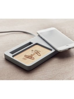 Chargeur sans fil et organiseur de bureau personnalisable en ciment calcaire et bambou. Le tarif "à partir de" est valable pour des quantités supérieures à 5000 pièces. Minimum de commande : 50 pièces