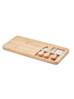 Planche à fromage en bambou personnalisable avec 2 couteaux. Le tarif "à partir de" est valable pour des quantités supérieures à 5000 pièces. Minimum de commande : 20 pièces