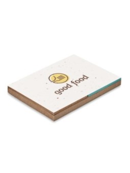Bloc-notes publicitaire avec couverture fabriquée à partir d'herbe et planter en terre après utilisation, la couverture contient une sélection de graines de fleurs sauvages de prairie. Fabriqué en UE. Le tarif "à partir de" est valable pour des quantités supérieures à 5000 pièces. Minimum de...