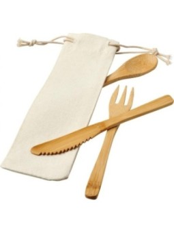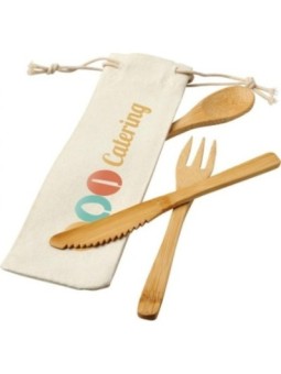 Ensemble de couverts promotionnels en bambou avec une pochette en coton. Le tarif "à partir de" est valable pour des quantités supérieures à 5000 pièces. Minimum de commande : 50 pièces.