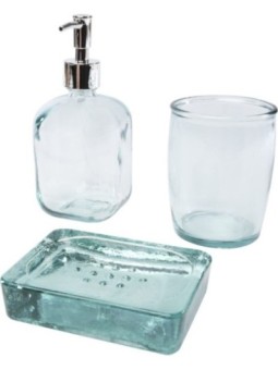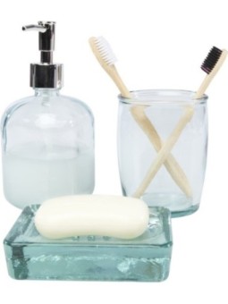 Ensemble d'accessoires salle de bain personnalisés en verre recyclé. Le tarif "à partir de" est valable pour des quantités supérieures à 5000 pièces. Minimum de commande : 25 pièces.
