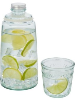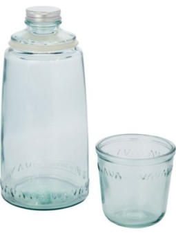 Ensemble de carafe et de verre publicitaires en verre recyclé. Le tarif "à partir de" est valable pour des quantités supérieures à 5000 pièces. Minimum de commande : 100 pièces.