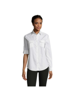 Chemise publicitaire pour femme en popeline avec poches. Disponible de la taille S à la taille M en bleu, blanc, marine. Existe également pour homme. Le tarif "à partir de" est valable pour des quantités supérieures à 5000 pièces. Minimum de commande : 25 pièces