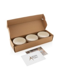 Ensemble de vaiselles pour service publicitaire : 3 bols en céramique avec un plateau en bambou. Le tarif "à partir de" est valable pour des quantités supérieures à 5000 pièces. Minimum de commande : 20 pièces