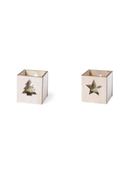 Bougie de Noël publictaire en bois et en verre parfumée à la vanille. Boîte en bois découpée au design original. Le tarif "à partir de" est valable pour des quantités supérieures à 5000 pièces.  Minimum de commande : 500 pièces