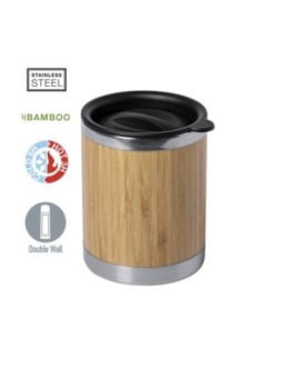 Verre promotionnel en bambou et en acier inoxydable avec bouchon de dosage. Le tarif "à partir de" est valable pour des quantités supérieures à 5000 pièces. Minimum de commande : 250 pièces.